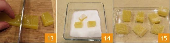 Laissez refroidir la gélatine dans un endroit frais et lorsque la température ambiante est atteinte, transférez le moule au réfrigérateur pendant au moins 4 heures. Passé ce temps, extrayez la gélatine et transférez-la sur une planche à découper. Selon le côté le plus long, coupez-la en bandes dans le sens de la longueur, puis découpez des dés, des rectangles ou des cubes 13.
