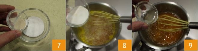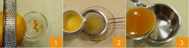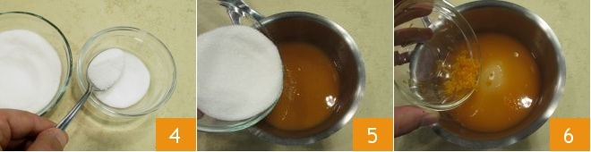 Prélevez 2-3 cuillères à café de la quantité de sucre, que vous mettrez de côté dans un bol 4, tandis que le reste peut être ajouté au jus d'orange 5. Ajoutez ensuite le zeste râpé 6 et faites cuire à feu doux. Laissez bouillir pendant 5 minutes.