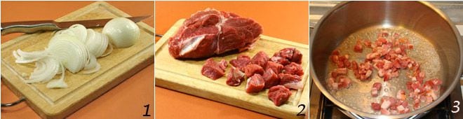 Épluchez et émincez finement les oignons 1; découpez la viande de bœuf en morceaux d'environ 3-4 cm de côté 2. Dans une casserole, faites fondre le beurre et ajoutez les lardons que vous laisserez dorer 3 ; une fois dorés, retirez-les de la casserole et mettez-les de côté 4.