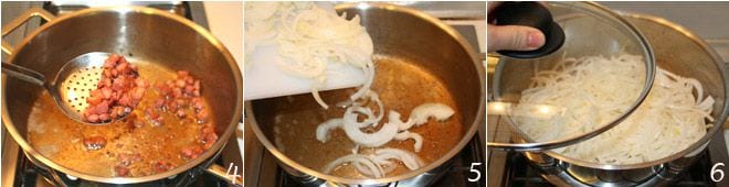 Dans la graisse libérée par les lardons, ajoutez les oignons 5 que vous ferez dorer à feu doux pendant environ 15 minutes en couvrant la casserole avec un couvercle 6 ; mélangez les oignons de temps en temps jusqu'à ce qu'ils soient complètement fanés, puis retirez le couvercle et ajoutez le sucre de canne 7 que vous ferez bien amalgamer aux oignons et caraméliser 8.