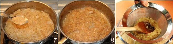 Transférez les oignons dans une passoire (ou un tamis) et, en les pressant avec une cuillère, éliminez l'excès de graisse 9 : gardez de côté les oignons et la graisse.