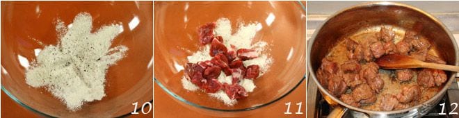 Allumez le four et réglez-le à 160°. Mélangez la farine avec le poivre moulu et le sel 10 et roulez-y la viande 11 jusqu'à la recouvrir entièrement ; faites dorer la viande dans un peu d'huile 12 et par petites quantités, en ajoutant, petit à petit, également la graisse égouttée des oignons.