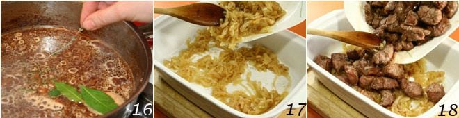 Prenez un plat à gratin assez haut (ou une casserole allant au four) et disposez-y une couche d'oignons 17, une de viande 18,