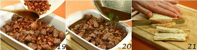 Versez sur la viande le liquide contenu dans la poêle 20, puis prenez les deux tranches de pain de mie (ou de pain de campagne), retirez la croûte extérieure 21