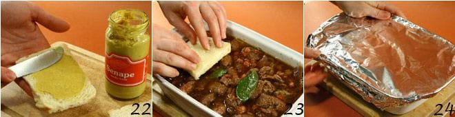 et tartinez-les de moutarde forte 22, puis disposez-les côte à côte avec le côté tartiné sur la viande 23.