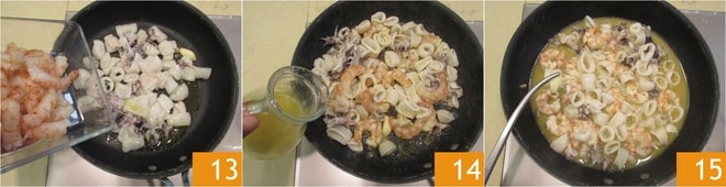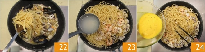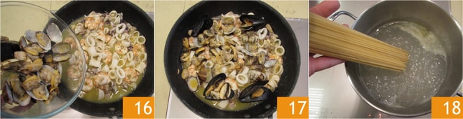 Ajoutez les moules et les palourdes dans la poêle avec les calamars et les crevettes 16, mélangez et éteignez le feu 17. Pendant ce temps, l'eau aura atteint l'ébullition, donc salez modérément et faites cuire les spaghettis 18.