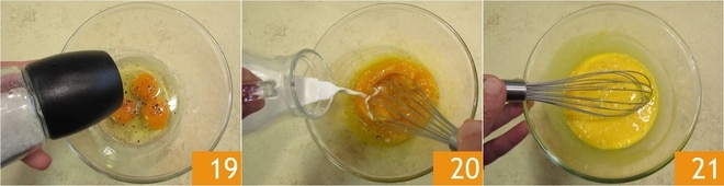 Entre-temps, préparez la crème aux œufs : versez les œufs entiers et le jaune dans un bol, salez 19, poivrez et ajoutez la crème 20, puis mélangez bien avec un fouet pour obtenir un mélange homogène 21.