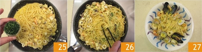 Parfumez avec le persil haché 25 et mélangez à nouveau 26. Servez immédiatement votre carbonara de la mer viareggina 27 !