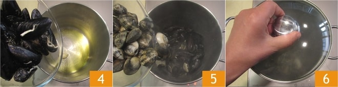 Dans une casserole, faites chauffer un filet d'huile avec une gousse d'ail, puis ajoutez les moules 4 et les palourdes 5, couvrez avec le couvercle 6 et laissez cuire à feu vif pendant quelques minutes.