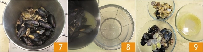 Lorsque les mollusques sont tous ouverts 7, éteignez le feu et filtrez le jus de cuisson 8. Décortiquez les moules et les palourdes, en laissant quelques-unes entières pour la décoration 9.