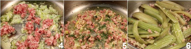 Une fois cuits, égouttez les cardons. Dans une autre casserole, mettez l'huile et les oignons verts que vous laisserez fondre à feu doux pendant environ 15 minutes ; ajoutez le lard haché 4, le thym et la cannelle 5 et laissez frire quelques minutes, puis ajoutez les cardons 6, mélangez délicatement et ajoutez le vin blanc que vous laisserez s'évaporer.