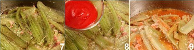Rectifiez l'assaisonnement en sel et poivre 7, ajoutez la purée de tomates 8 et éventuellement une louche d'eau chaude, puis laissez cuire jusqu'à ce que tous les ingrédients soient bien imprégnés 9 et que le fond de cuisson soit réduit. Ajoutez le parmesan râpé et servez les cardons à l'étouffée encore chauds.