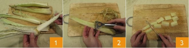 Pour préparer le cardone de Bénévent, commencez par la préparation du Bouillon de poule (ou poulet). Pendant ce temps, consacrez-vous au nettoyage du cardon (variété gobbo) : éliminez les côtes les plus externes et coriaces 1 en conservant celles de l'intérieur, qui sont tendres. Lavez-les soigneusement et éliminez les filaments avec l'aide d'un épluche-légumes 2. Coupez les côtes en morceaux 3