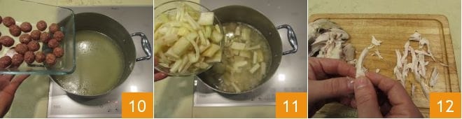 Après avoir égoutté le poulet, faites cuire les boulettes dans la casserole avec le bouillon de poulet pendant environ 10 minutes 10, puis ajoutez les cardons bien égouttés et faites cuire encore 15-20 minutes 11. Pendant que les boulettes et le cardon cuisent dans le bouillon, effilochez à la main le poulet, en le réduisant en petites lamelles 12.