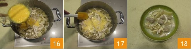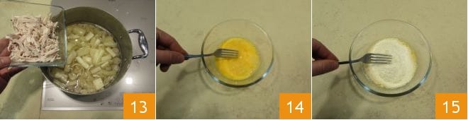 Ajoutez-les également dans le bouillon 13. Enfin, cassez les œufs dans un récipient 14 et mélangez avec une pincée de sel et le parmesan râpé 15.