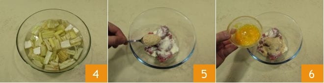 et immergez-les dans de l'eau froide acidulée, c'est-à-dire où vous aurez pressé un citron, pour éviter qu'elles ne noircissent 4. Entre-temps, occupez-vous des boulettes. Dans un récipient, mélangez ensemble la viande hachée, le sel et le poivre, le parmesan râpé et la chapelure 5. Ensuite, ajoutez les œufs légèrement battus 6