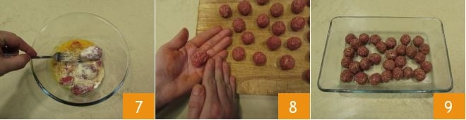 et mélangez bien le tout 7, jusqu'à obtenir une pâte douce mais compacte. Formez des boulettes d'environ 10 grammes chacune 8 (de cette manière, vous devriez en obtenir environ 30) et gardez-les au réfrigérateur couvertes de film plastique jusqu'à ce que le bouillon soit prêt 9.