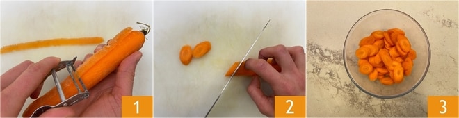 Pour préparer les carottes bouillies, commencez par mettre sur le feu une casserole pleine d'eau salée. Lavez les carottes, épluchez-les 1 et coupez-les. Ensuite, coupez-les en tranches transversales d'environ un demi-cm d'épaisseur 2 et rassemblez-les progressivement dans un bol 3.