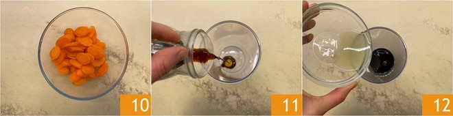 Transférez-les à nouveau dans un bol sec 10 et préparez la sauce. Dans un récipient haut et étroit, versez la sauce soja 11 et le jus de citron 12.
