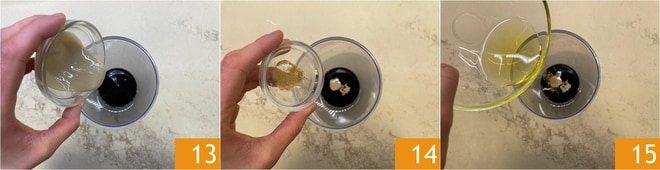 Ajoutez le tahini 13, le gingembre en poudre 14 et l'huile de sésame 15.