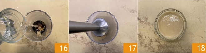 Ajoutez enfin l'eau 16 et mixez le tout avec un mixeur plongeant 17 jusqu'à obtenir une sauce lisse et crémeuse 18.