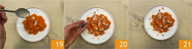 Dressez les carottes en disposant la sauce par-dessus 19; ajoutez les graines de sésame 20 et la partie verte de l'oignon nouveau coupée en fines tranches 21.
