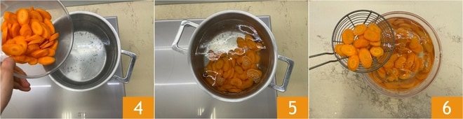 Dès que l'eau atteint l'ébullition, plongez les carottes 4 et faites-les cuire pendant 4-5 minutes si vous préférez des carottes plus croquantes, sinon si vous les préférez tendres, faites-les cuire pendant 7-8 minutes maximum. Pendant ce temps, remplissez le bol d'eau et de glace. Au fur et à mesure que les carottes atteignent la consistance que vous aimez, égouttez-les et transférez-les dans le bol 6. De cette façon, vous arrêterez la cuisson et obtiendrez une couleur éclatante.
