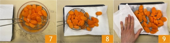 Égouttez-les à nouveau 7, transférez-les sur un plateau recouvert de papier absorbant 8 et séchez-les bien avec un autre papier 9.