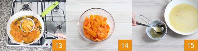 À ce stade, utilisez une passoire pour égoutter les carottes 13 et transférez-les dans un saladier 14. Laissez réduire le fond de cuisson pendant encore 10 minutes à feu vif, puis filtrez-le 15,