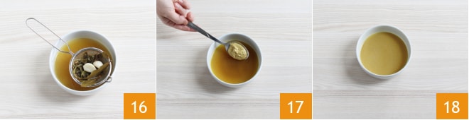 afin d'éliminer l'ail et les herbes aromatiques 16. Laissez-le refroidir, puis ajoutez la moutarde 17 et mélangez pour amalgamer les ingrédients 18.