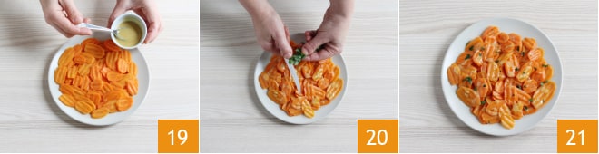 Transférez les carottes dans un plat de service, en évitant de les superposer. Arrosez-les avec la sauce à la moutarde 19 et ajoutez du persil haché par-dessus 20. Les carottes sont prêtes à être servies 21 !