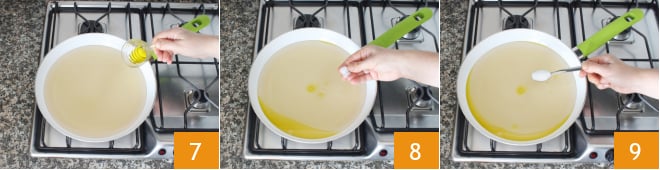 l'huile 7, une pincée de sel 8 et une cuillère à café de sucre 9.
