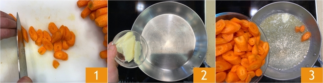 Pour préparer les carottes au beurre et yaourt au curry fumé, commencez par équeuter les carottes, les peler et les couper en biais en rondelles d'environ un demi-centimètre d'épaisseur 1 ; vous devriez obtenir environ 750 g de carottes nettoyées. Dans une grande poêle, faites fondre le beurre 2, puis ajoutez les carottes 3.