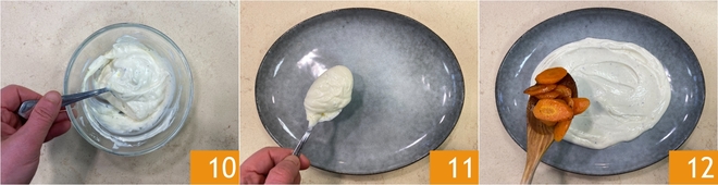 Mélangez bien pour homogénéiser 10. Répartissez la sauce au yaourt dans le fond du plat de service 11, puis ajoutez les carottes 12.