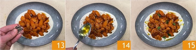 Terminez avec les graines de sésame torréfiées 13 et le jus de cuisson des carottes 14. Garnissez de quelques feuilles de persil et servez vos carottes au beurre et yaourt au curry fumé 15 !
