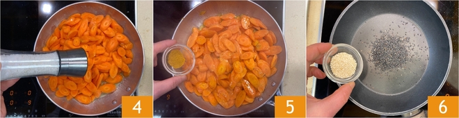 Salez 4, poivrez et aromatisez avec le curry fumé 5. Faites cuire à feu moyen‑vif pendant 10–15 minutes, en remuant souvent. Pendant ce temps, faites torréfier les graines de sésame blanches et noires dans une poêle antiadhésive pendant environ 3 minutes 6.
