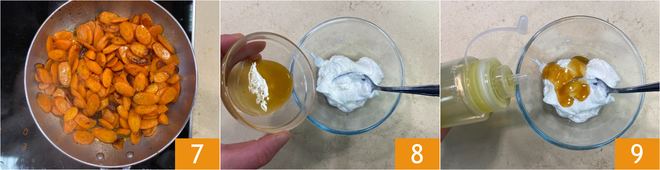 Quand les carottes sont cuites 7, occupez‑vous de la sauce au yaourt : mettez le yaourt et le miel dans un petit bol 8, puis assaisonnez avec l'huile 9, le sel et le poivre.