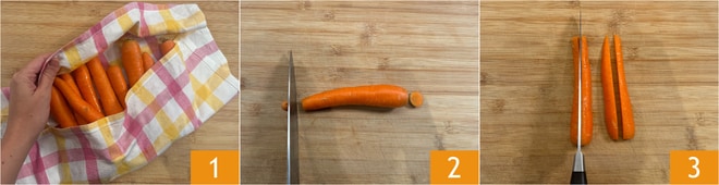 Pour préparer les carottes au four, commencez par les laver soigneusement, puis séchez-les avec un torchon propre 1. Épluchez-les 2 et divisez-les en deux dans le sens de la longueur 3.