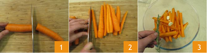 Pour préparer les carottes rôties aux pistaches, commencez par laver les carottes et couper les extrémités. Puis divisez-les en deux 1 puis taillez des bâtonnets en les coupant dans le sens de la longueur 2. Mettez les carottes dans un bol et assaisonnez avec l'ail pelé et le romarin 3.