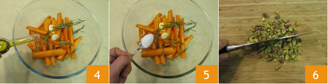 Arrosez-les d'huile d'olive 4 et assaisonnez de sel 5. Hachez ensuite grossièrement les pistaches avec un couteau 6.