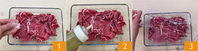 Pour préparer le carpaccio de bœuf en salade d'asperges, commencez par assaisonner les tranches de contre-filet de bœuf avec du sel 1, du poivre et de l'huile 2. Recouvrez de film alimentaire 3 et placez au réfrigérateur.