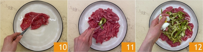 Vous êtes prêt à dresser : disposez les tranches de viande sur le plat de service 10, puis déposez dessus la salade d'asperges 11, en la répartissant de manière uniforme. Écalez et émiettez les œufs durs 12.