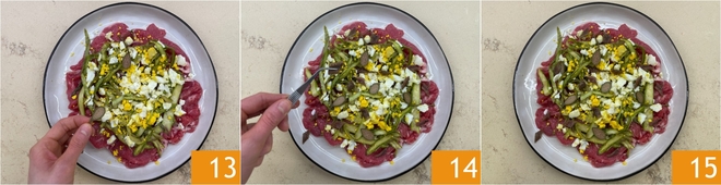 Enfin, garnissez avec les fleurs de câpre coupées en deux 13 et les filets d'anchois coupés en losanges 14. Votre carpaccio de bœuf en salade d'asperges est prêt à être servi 15 !