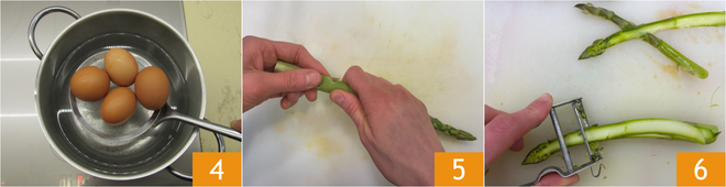 Plongez les œufs dans une petite casserole d'eau froide 4, portez à légère ébullition puis comptez 7 minutes de cuisson à partir de ce moment. Pendant ce temps, Comment nettoyer les asperges : retirez l'extrémité ligneuse de la base 5, puis émincez-les finement dans la longueur à l'aide d'un épluche-légumes 6.