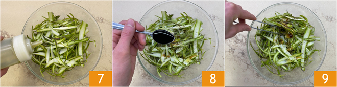 Transférez les asperges dans un bol et assaisonnez-les avec de l'huile 7, du sel, du poivre et du vinaigre balsamique 8. Mélangez délicatement 9.