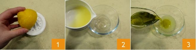 Pour préparer le carpaccio de bœuf avec roquette et parmesan, commencez par la sauce citronnette ; pressez les citrons 1 et placez le jus filtré dans un bol 2 : ajoutez l'huile 3,