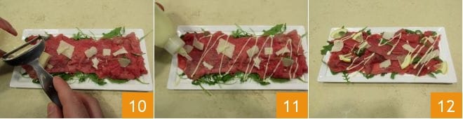 Ajoutez également les copeaux de fromage 10, puis terminez avec la sauce citronnette 11 et quelques tranches de citron, enfin vous pourrez servir et déguster votre carpaccio de bœuf avec roquette et parmesan 12.