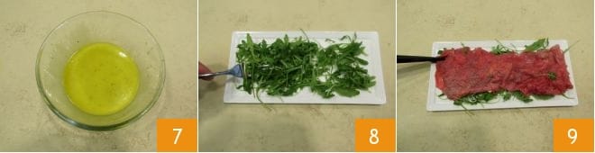 Une fois prête 7, mettez la sauce dans un distributeur. Placez la roquette sur un plat de service, en la répartissant uniformément 8, coupez la viande en fines tranches à l'aide d'une trancheuse et disposez-la sur la roquette 9.