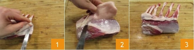 Pour préparer le carré d'agneau au thym et lard de Colonnata, commencez par nettoyer la viande de l'excès de gras. Pour cela, utilisez un couteau à lame fine et aiguisée, en partant d'une des extrémités 1 et en le laissant glisser sur toute la surface de la viande 2. Une fois qu'il est bien nettoyé 3