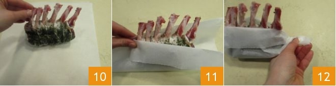 Transférez-le ensuite sur une feuille de papier sulfurisé 10 et repliez le papier de manière à ne couvrir que la viande et laisser les os découverts 11. Fermez-le ensuite comme un bonbon 12.